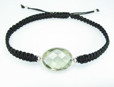 AnnS Schmuck ist handgefertigter Schmuck aus unserer Werkstatt in Deutschland. Edle Materialien wie Seide, Edelsteine, Perlen und 925 Silber werden zu feinen Kompositionen zusammengestellt: Makramee-Armband aus schwarzem Nylonband kombiniert mit einem facettierten, ovalen Prasiolith und 925 Silber. Stein 16x12mm, Breite Armband 5mm