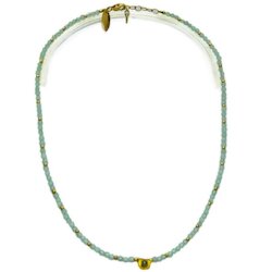 Eine schöne, etwas längere Kette, handgefertigt aus einer Kombination von aquafarbener Jade, Hämatit und goldenen Myoki-Perlen sowie einem Labradorit-Anhänger mit 18kt vergoldetem Messing.