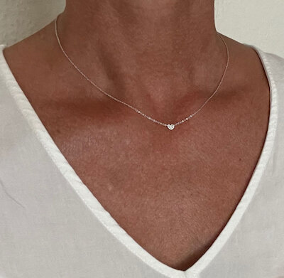 Zarte Kette aus 585/14kt Weißgold mit einem kleinen Herzen, das mit 13 funkelnden Brillianten besetzt ist. Die Diamanten sind im Brillantschliff gefertigt und haben zusammen ein Gewicht von 0,04ct. Die Farbe der Brillanten ist Top Wesselton (feines Weiß) und die Reinheit si (small inclusions, kleine Einschlüsse, die erst ab einer 10fachen Vergrößerung sichtbar sind). Ein schönes Geschenk für einen Menschen, der einem am Herzen liegt - oder auch einfach für sich selbst!