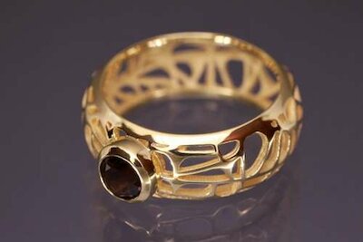 Ring aus 925 Silber, vergoldet, mit einem facettierten Rauchquarz. Wunderschön gearbeitet ist die gewölbte Ringschiene mit ihrem durchbrochenen Muster.