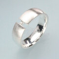 Schöner Silberschmuck von Manuela Carl: Optisch wie ein Spannring scheint der Diamant zwischen den Schienen zu schweben. Der Ring ist aus 925 Silber, außen gebürstet und von innen leicht bombiert für einen angenehmen Tragekomfort. Diamant W/P1, Stegbreite 6mm