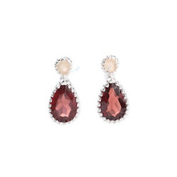 Muja Juma ist feiner, handgefertigter Designer-Schmuck aus den Niederlanden mit echten Edelsteinen: zarte Ohrringe aus 925 Silber mit einem runden, lachsfarbenen Mondstein und einem facettierten, eckigen Labradorit.