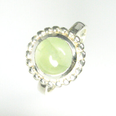 Hübscher Ring aus 925 Silber mit einem runden Top. Der als Cabochon geschliffe grüne Stein wird von kleinen Silberkugeln umrahmt, wodurch schöne Lichtreflexe entstehen.